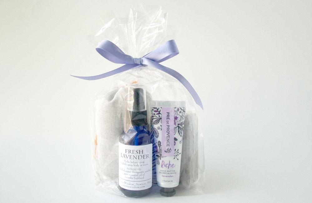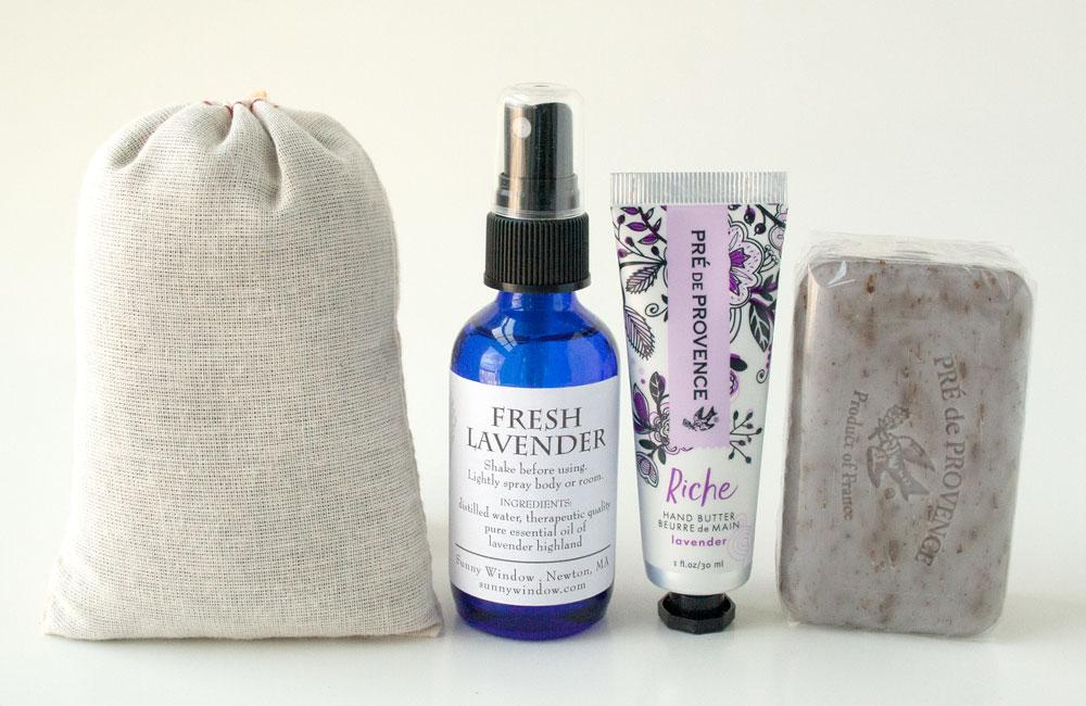 Set contains: Sunny Window large lavender sachet, 5.3-ounce lavender soap, 1-ounce french lavender hand cream (with shea butter, cocoa butter and mango butter), and 2-ounce Sunny Window handcrafted Fresh Lavender spray (distilled water, organic lavandula angustifolia essential oil)