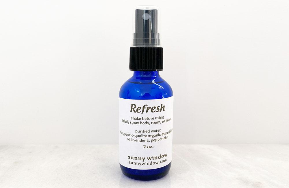 Peppermint and lavender create a wonderful pick-me-up. Keep at your desk, in the car or in the kitchen. Really enhances your mood. Great for body, rooms and linens. Handmade in our Sunny Window studio with therapeutic quality essential oils and purified water. 2 oz.