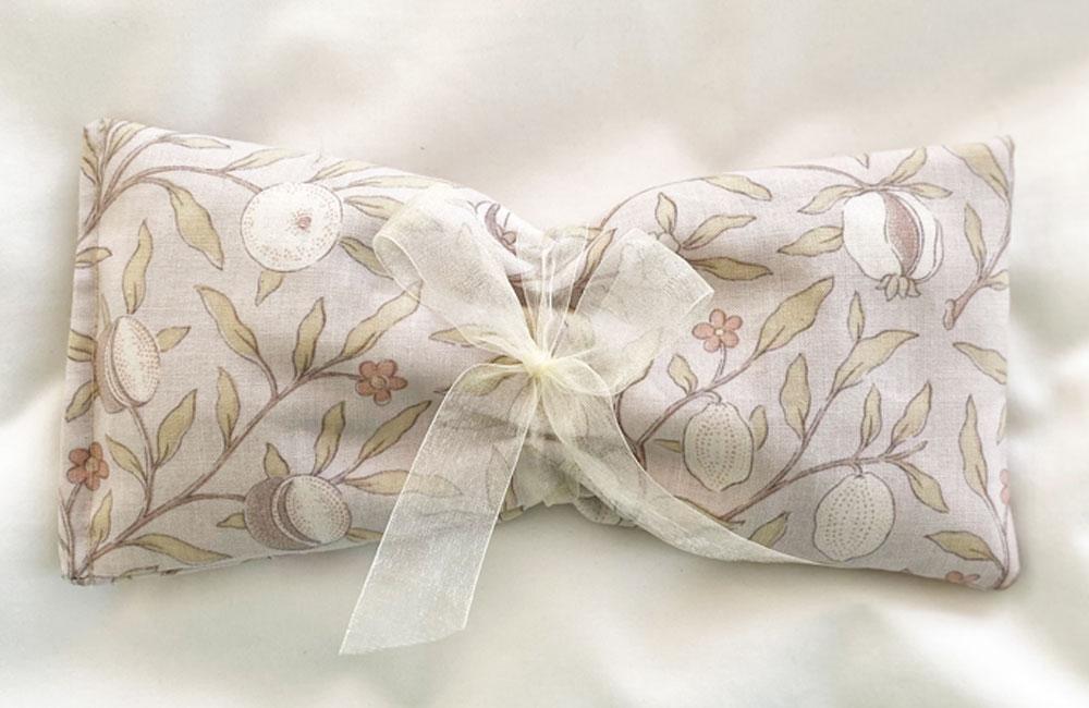 Filled with flax seeds and the finest French lavender, our soft cotton eye pillow features William Morris' classic Fruit pattern, designed in 1864, and rendered here in serene, subtle shades of gray, green and pink. Heat in the microwave or cool in the fridge or freezer for a relaxing eye mask. Great for yoga, naps, headache relief, and all kinds of rest and relaxation. Handmade by Sunny Window.